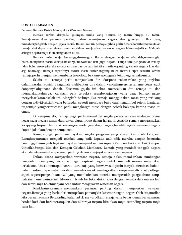 2018-05-15 Partisipasi adalah Hak. Belia Jadi Rakan Pembangunan Negara Majlis Belia Malaysia. Contoh Karangan Bahasa Malaysia Kandungan Peranan remaja dalam membentuk sahsiah diri Peranan remaja dalam mendalami ilmu agama Peranan remaja dalam taat kepada ibu bapa Peranan remaja dalam menghormati guru-guru Menjalinkan hubungan yang baik dengan rakan-rakan Peranan remaja berusaha bersungguh-sungguh Kesimpulan.